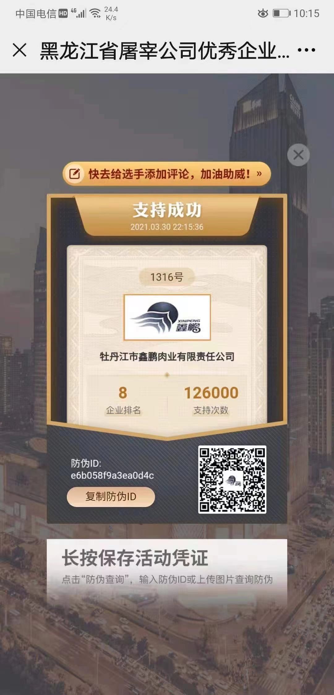牡丹江市鑫鵬肉業(yè)有限責(zé)任公司參加黑龍江省屠宰行業(yè)誠信企業(yè)評選名列第八!鑫鵬肉業(yè)從籍籍無名到躍升問鼎,取得這份榮譽(yù),是我們共同堅持不懈、同心同德的結(jié)果!感謝全體鑫鵬人的齊心努力!感謝摯愛親朋的鼎力協(xié)助!鑫鵬人一定不負(fù)眾望,以更好更優(yōu)質(zhì)的產(chǎn)品回饋家鄉(xiāng)!回饋社會!