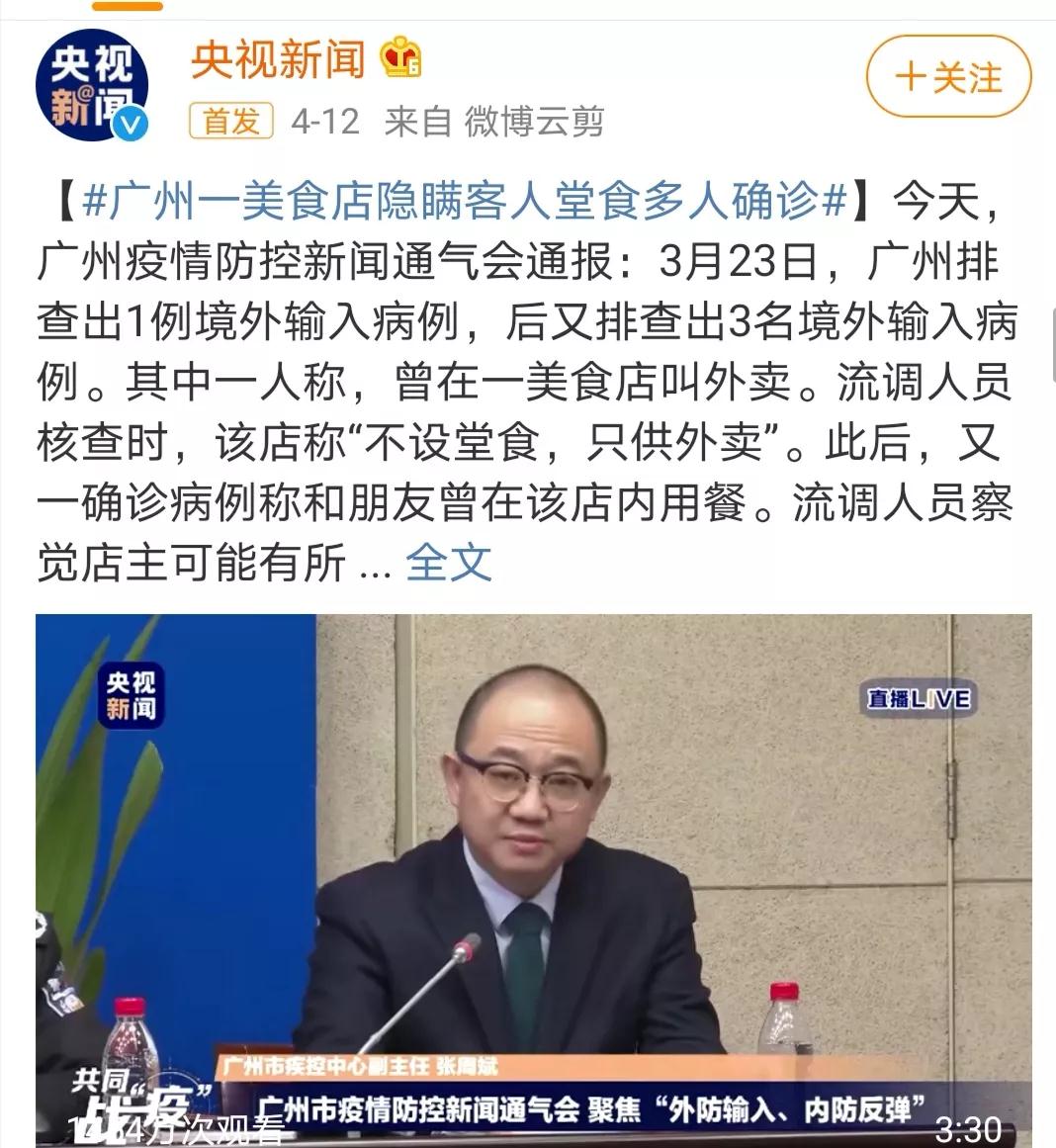 3月23日,廣州排查出1例境外輸入病例,后又排查出3名境外輸入病例。而其中一人稱曾在一家美食店叫外賣,另一人稱曾和朋友在同一美食店用餐。